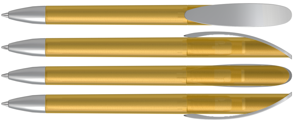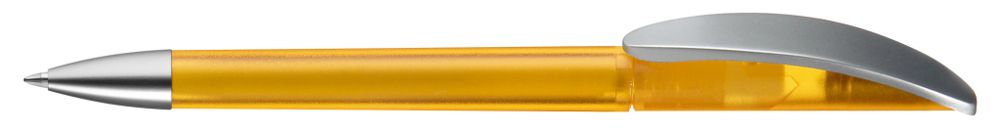 Drehkugelschreiber mit transparent gefrostetem oder gedeckt mattem Gehäuse, Bogenclip silber matt und schwerer Metallspitze matt verchromt.