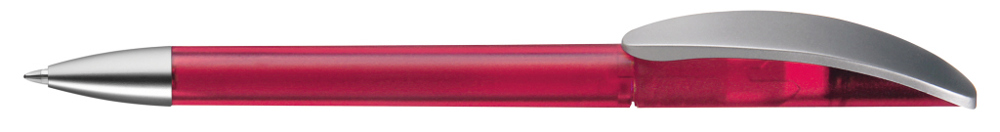 Drehkugelschreiber mit transparent gefrostetem oder gedeckt mattem Gehäuse, Bogenclip silber matt und schwerer Metallspitze matt verchromt.