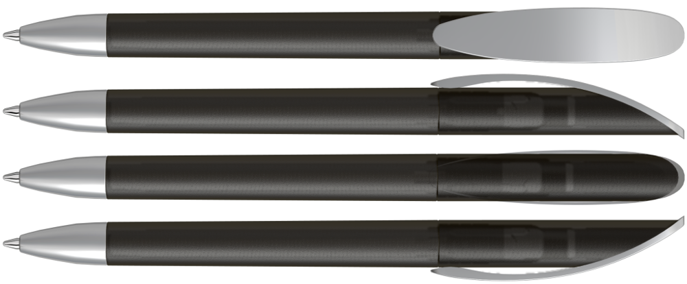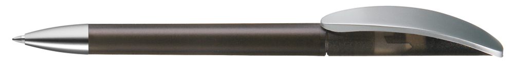 Drehkugelschreiber mit transparent gefrostetem oder gedeckt mattem Gehäuse, Bogenclip silber matt und schwerer Metallspitze matt verchromt.