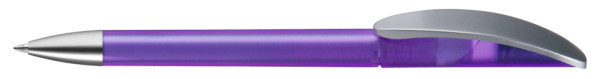 Drehkugelschreiber mit transparent gefrostetem oder gedeckt mattem Gehäuse, Bogenclip silber matt und schwerer Metallspitze matt verchromt.