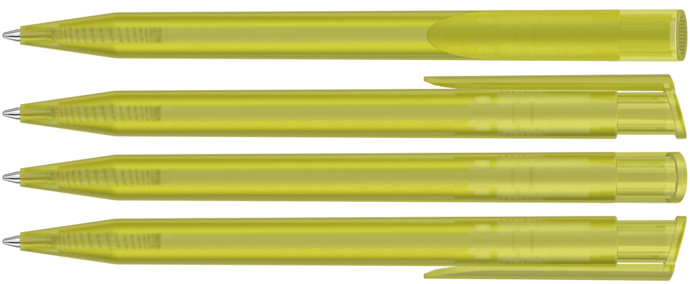 Druckkugelschreiber mit transparent gefrostetem Gehäuse und Clipdrücker.