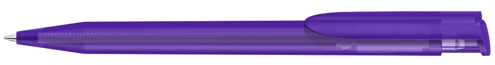 Druckkugelschreiber mit transparent gefrostetem Gehäuse und Clipdrücker.