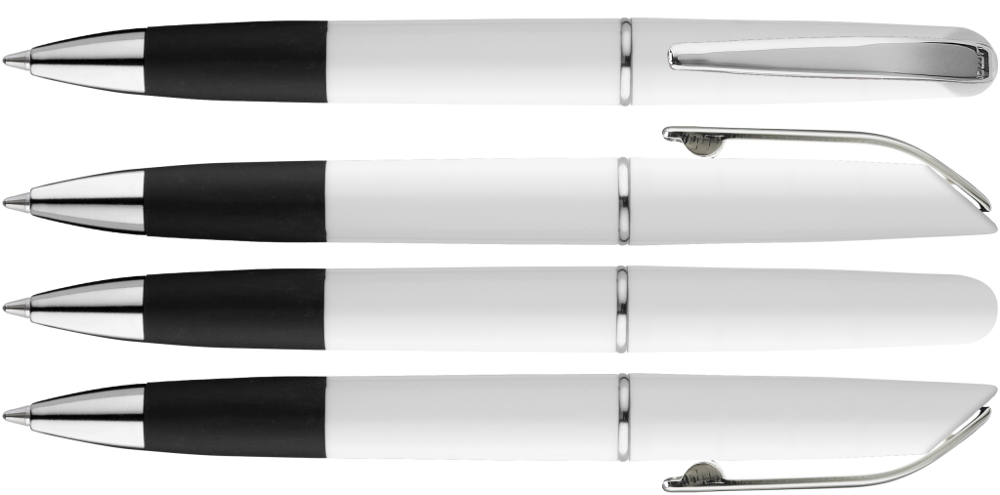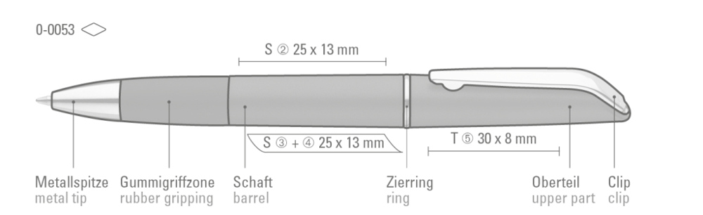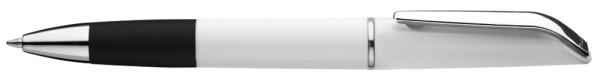 Drehkugelschreiber mit gedeckt glänzendem Gehäuse und Gummigriffzone in schwarz. Metallclip, Zierring und Metallspitze glanzverchromt.