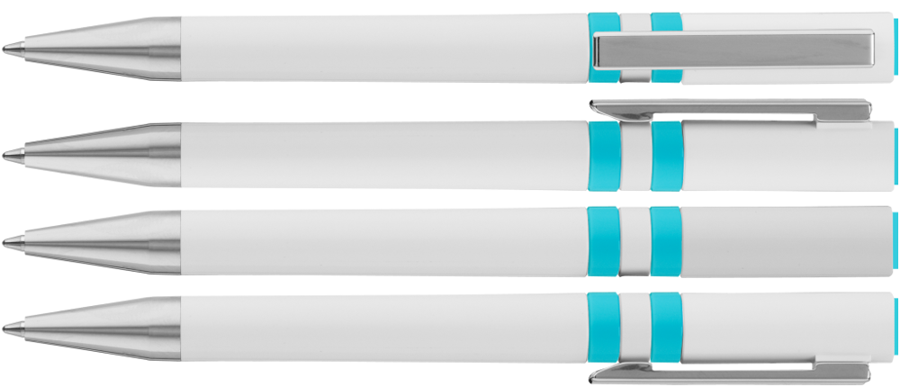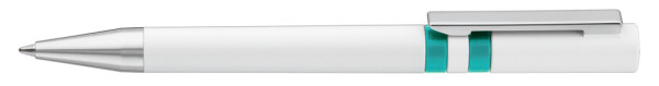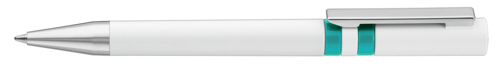 Drehkugelschreiber mit gedeckt glänzendem Gehäuse in weiß, farbig eingelassene Ringe und Stopfen im Oberteil. Metallclip und Spitze in silber glänzend.