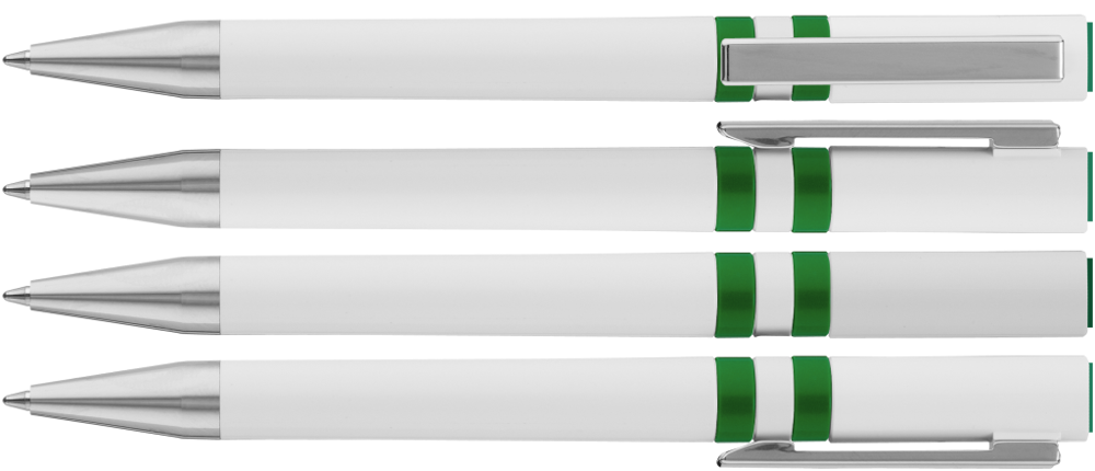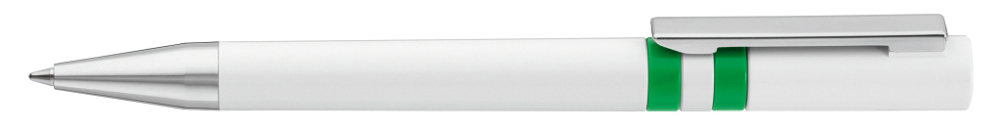Drehkugelschreiber mit gedeckt glänzendem Gehäuse in weiß, farbig eingelassene Ringe und Stopfen im Oberteil. Metallclip und Spitze in silber glänzend.