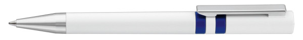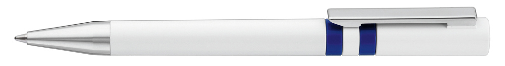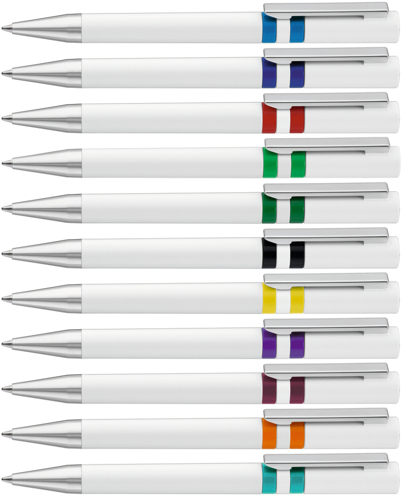 Drehkugelschreiber mit gedeckt glänzendem Gehäuse in weiß, farbig eingelassene Ringe und Stopfen im Oberteil. Metallclip und Spitze in silber glänzend.