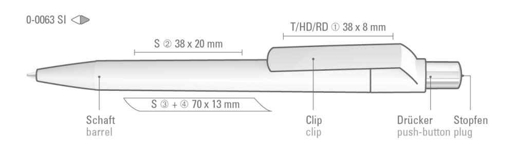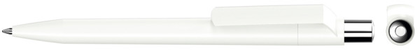Druckkugelschreiber mit weiß gedeckt glänzendem Gehäuse, silber glänzendem Drücker und farbigem Stopfen.