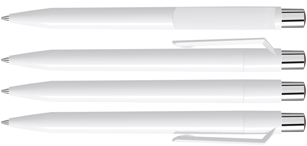 Druckkugelschreiber mit weiß gedeckt glänzendem Gehäuse, silber glänzendem Drücker und farbigem Stopfen.