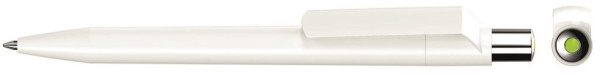 Druckkugelschreiber mit weiß gedeckt glänzendem Gehäuse, silber glänzendem Drücker und farbigem Stopfen.
