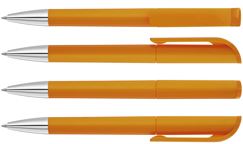 Drehkugelschreiber mit gedeckt glänzendem Gehäuse in weiß, farbig glänzendem Stopfen und Spitze glanzverchromt.
