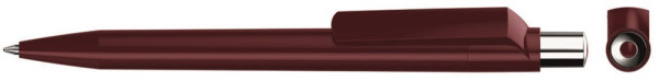 Druckkugelschreiber mit farbig gedeckt glänzendem Gehäuse, silber glänzendem Drücker und farbigem Stopfen.