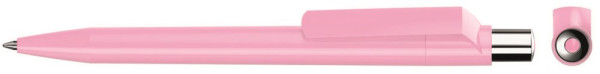 Druckkugelschreiber mit farbig gedeckt glänzendem Gehäuse, silber glänzendem Drücker und farbigem Stopfen.