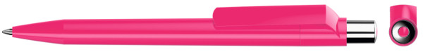 Druckkugelschreiber mit farbig gedeckt glänzendem Gehäuse, silber glänzendem Drücker und farbigem Stopfen.