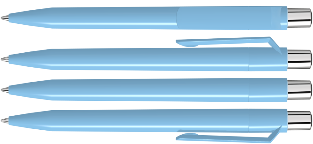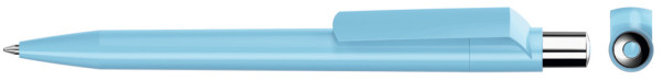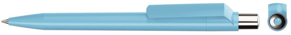 Druckkugelschreiber mit farbig gedeckt glänzendem Gehäuse, silber glänzendem Drücker und farbigem Stopfen.