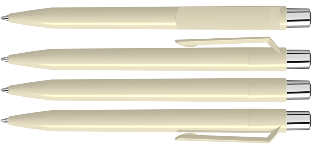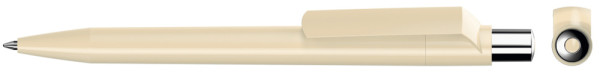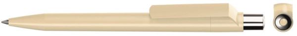 Druckkugelschreiber mit farbig gedeckt glänzendem Gehäuse, silber glänzendem Drücker und farbigem Stopfen.