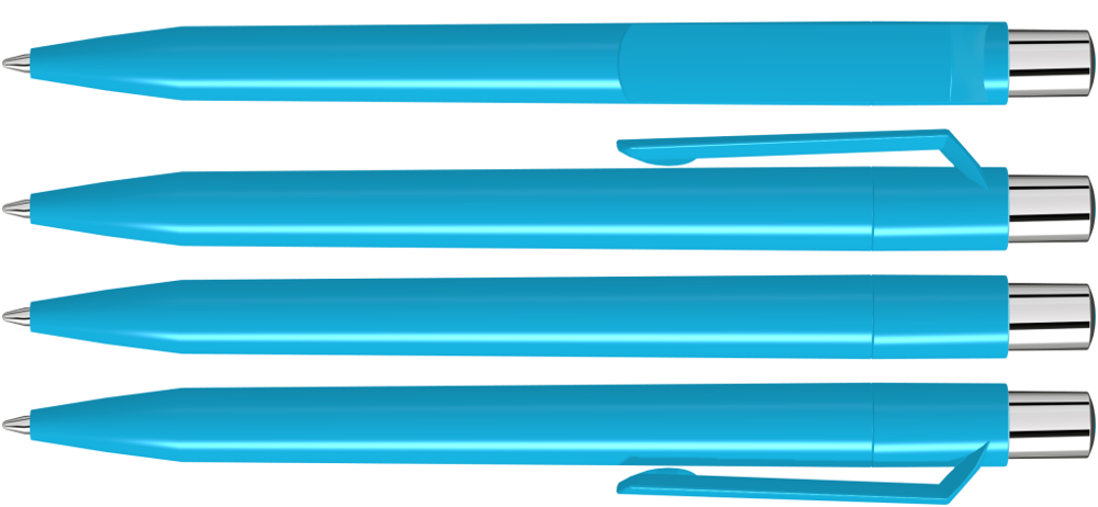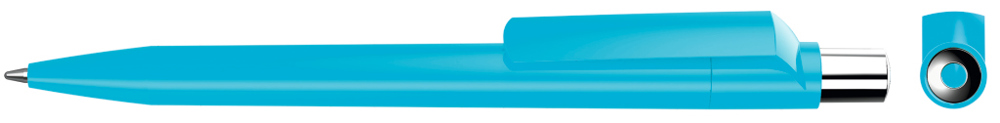 Druckkugelschreiber mit farbig gedeckt glänzendem Gehäuse, silber glänzendem Drücker und farbigem Stopfen.