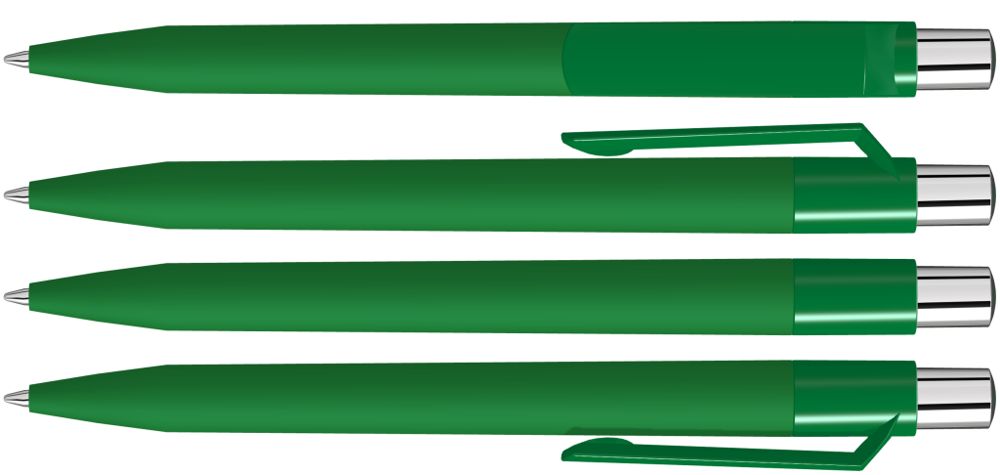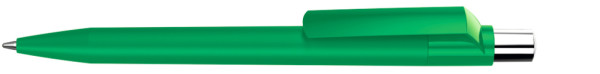 Druckkugelschreiber mit Softtouch-Schaft, gedeckt glänzendem Clip, silber glänzendem Drücker und farbigem Stopfen.