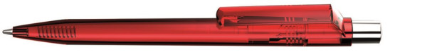 Druckkugelschreiber mit transparent glänzendem Gehäuse, silber glänzendem Drücker und farbigem Stopfen.