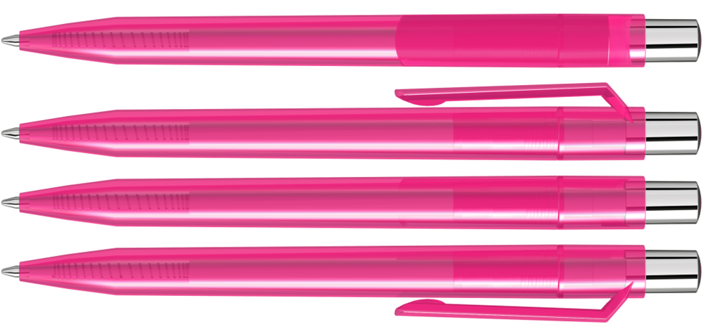 Druckkugelschreiber mit transparent glänzendem Gehäuse, silber glänzendem Drücker und farbigem Stopfen.