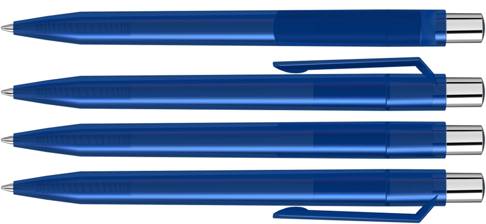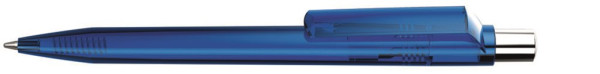 Druckkugelschreiber mit transparent glänzendem Gehäuse, silber glänzendem Drücker und farbigem Stopfen.