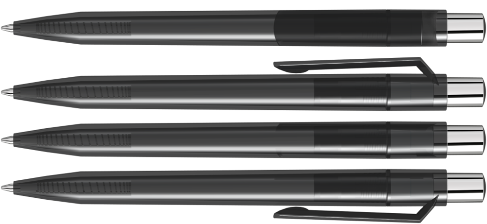 Druckkugelschreiber mit transparent glänzendem Gehäuse, silber glänzendem Drücker und farbigem Stopfen.