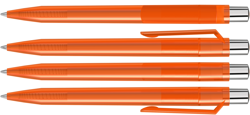 Druckkugelschreiber mit transparent glänzendem Gehäuse, silber glänzendem Drücker und farbigem Stopfen.