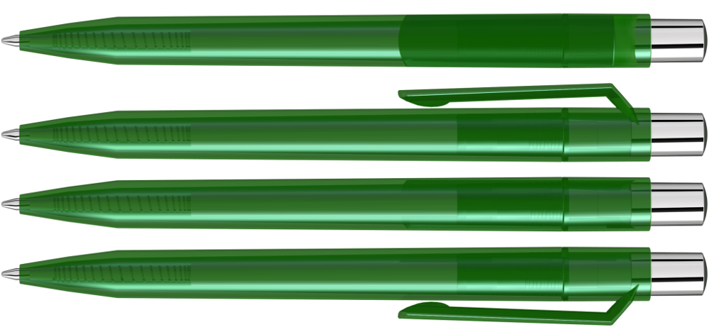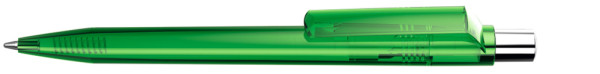 Druckkugelschreiber mit transparent glänzendem Gehäuse, silber glänzendem Drücker und farbigem Stopfen.