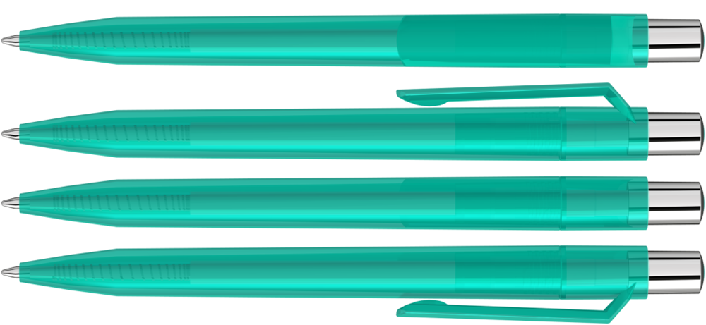 Druckkugelschreiber mit transparent glänzendem Gehäuse, silber glänzendem Drücker und farbigem Stopfen.