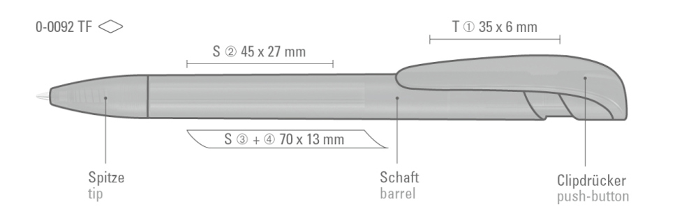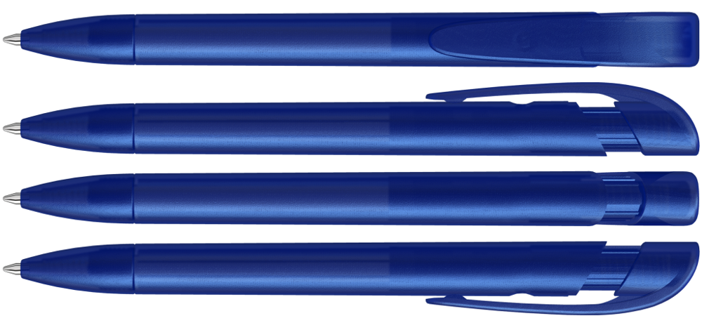 Druckkugelschreiber mit transparent gefrostetem Gehäuse, breitem Bogenclipdrücker und Spitze.