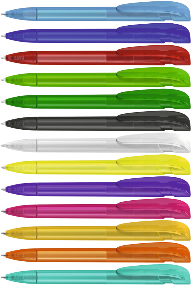 Druckkugelschreiber mit transparent gefrostetem Gehäuse, breitem Bogenclipdrücker und Spitze. mehr