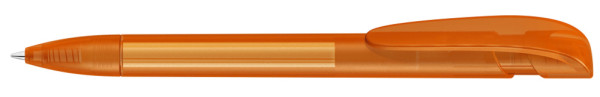 Druckkugelschreiber mit transparent gefrostetem Gehäuse, breitem Bogenclipdrücker und Spitze.