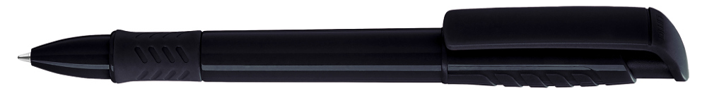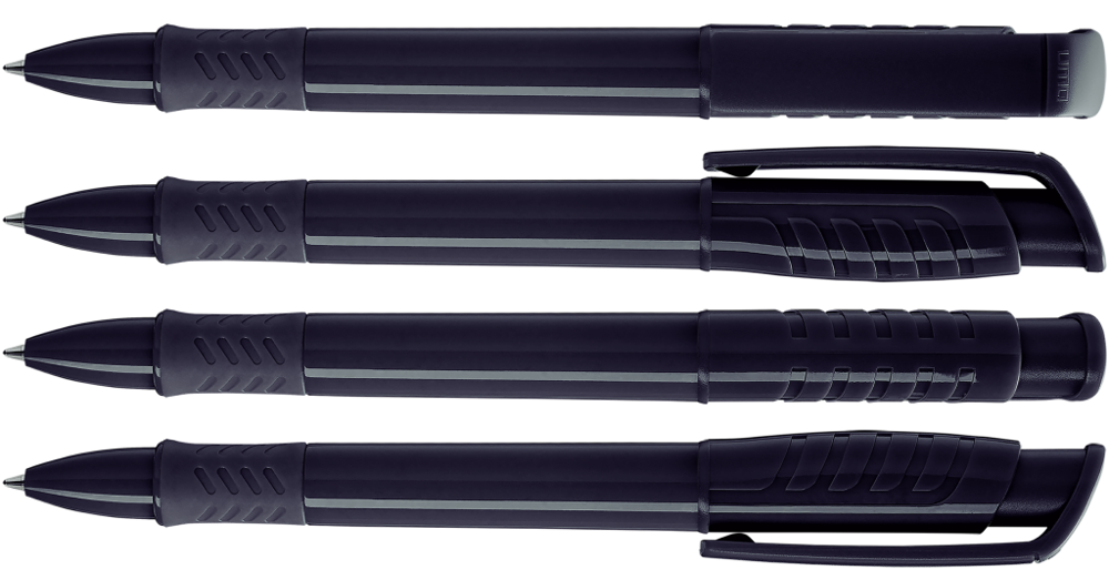 Druckkugelschreiber mit gedeckt glänzendem Gehäuse in weiß, Griffzone und Zierring farbig oder unifarben gedeckt glänzend schwarz.