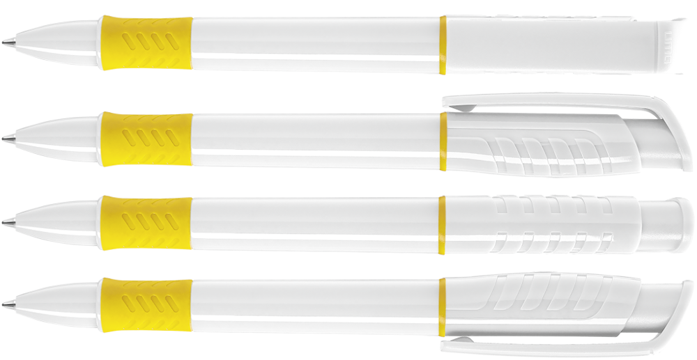 Druckkugelschreiber mit gedeckt glänzendem Gehäuse in weiß, Griffzone und Zierring farbig oder unifarben gedeckt glänzend schwarz.