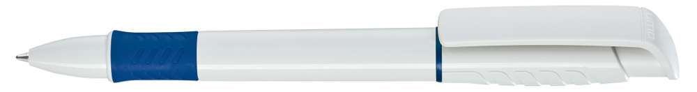 Druckkugelschreiber mit gedeckt glänzendem Gehäuse in weiß, Griffzone und Zierring farbig oder unifarben gedeckt glänzend schwarz.