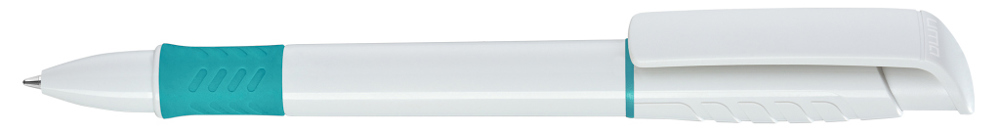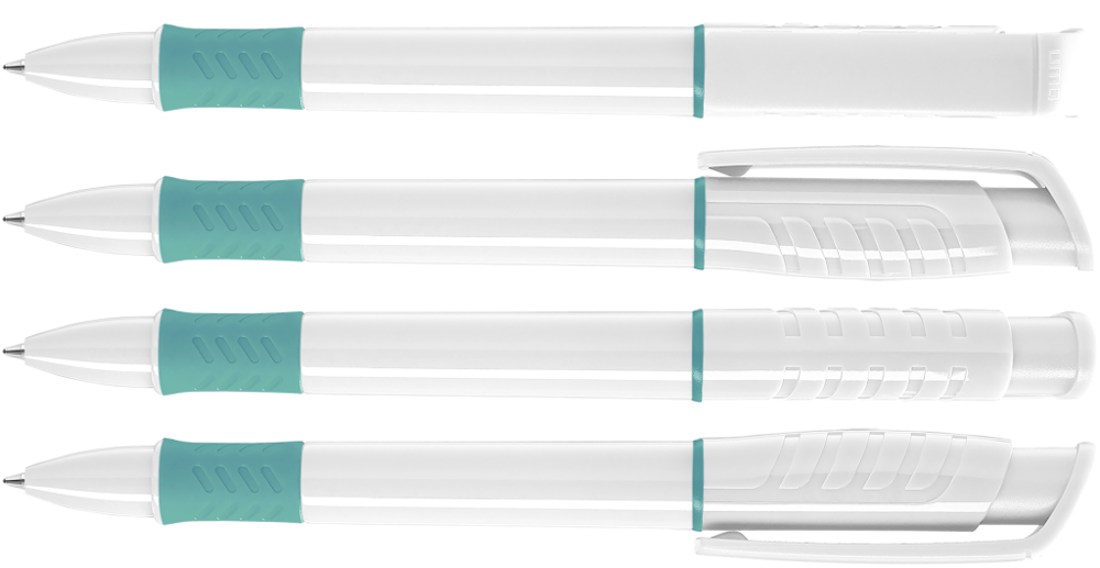 Druckkugelschreiber mit gedeckt glänzendem Gehäuse in weiß, Griffzone und Zierring farbig oder unifarben gedeckt glänzend schwarz.