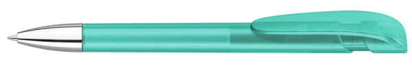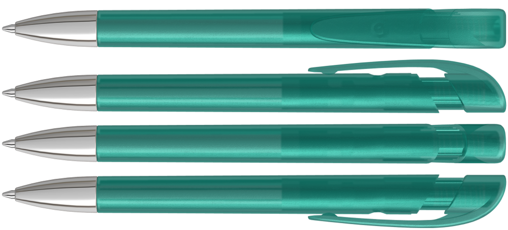 Druckkugelschreiber mit transparent gefrostetem Gehäuse, breitem Bogenclipdrücker und silberner Spitze glanzverchromt.