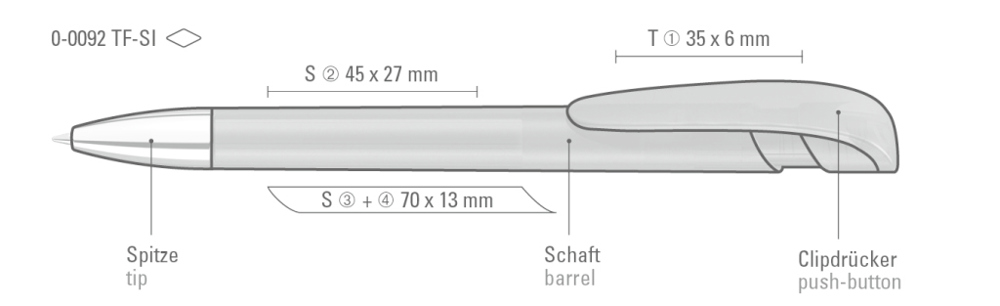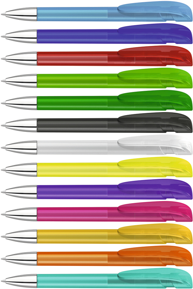 Druckkugelschreiber mit transparent gefrostetem Gehäuse, breitem Bogenclipdrücker und silberner Spitze glanzverchromt.