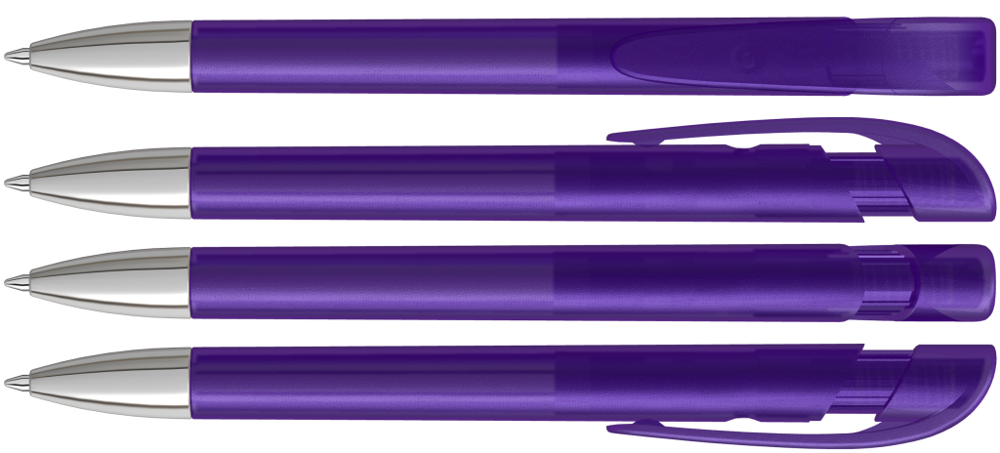 Druckkugelschreiber mit transparent gefrostetem Gehäuse, breitem Bogenclipdrücker und silberner Spitze glanzverchromt.