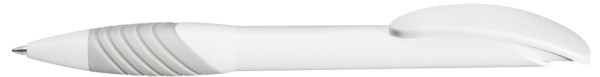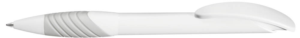 Druckkugelschreiber mit gedeckt mattem Gehäuse, Bogenclipdrücker und Spitze in weiß, ergonomische, farbige Gummigriffzone.