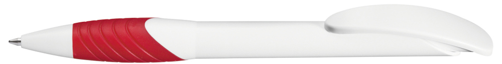 Druckkugelschreiber mit gedeckt mattem Gehäuse, Bogenclipdrücker und Spitze in weiß, ergonomische, farbige Gummigriffzone.