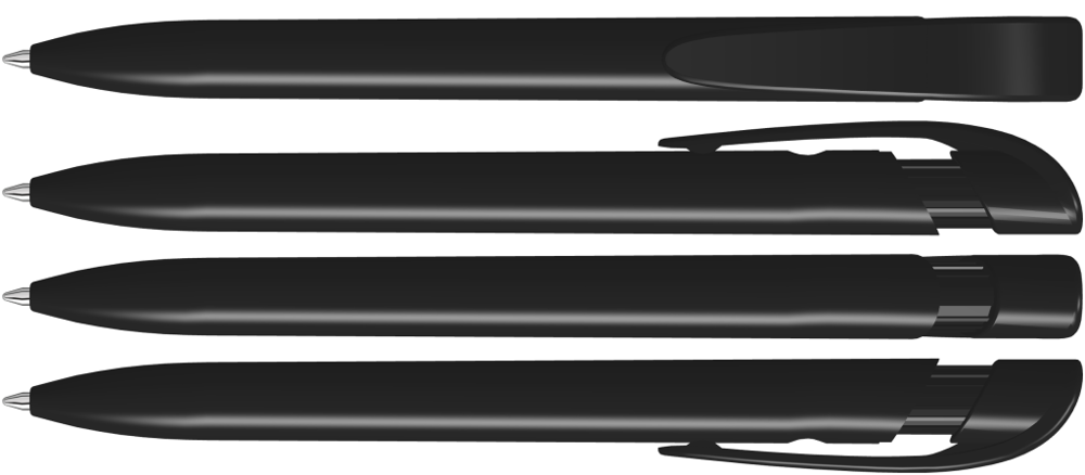 Druckkugelschreiber mit gedeckt glänzendem Gehäuse in schwarz oder weiß und breitem Bogenclipdrücker.