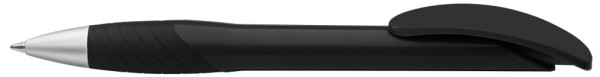 Druckkugelschreiber mit gedeckt glänzendem Gehäuse, Bogenclipdrücker, ergonomische Gummigriffzone und Metallspitze matt verchromt.