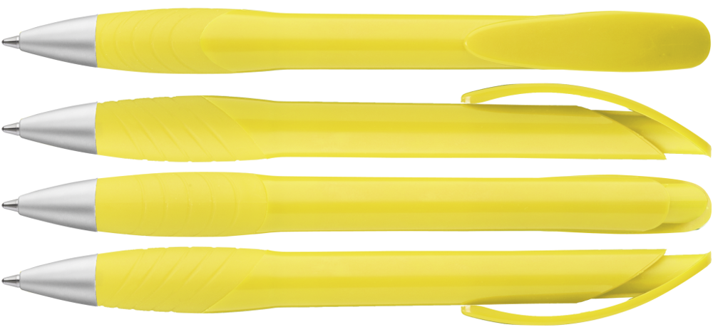 Druckkugelschreiber mit gedeckt glänzendem Gehäuse, Bogenclipdrücker, ergonomische Gummigriffzone und Metallspitze matt verchromt.