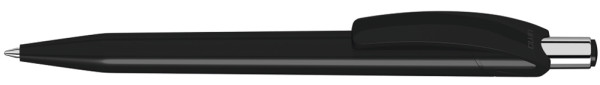Druckkugelschreiber mit glänzend gedecktem Gehäuse und Drückerstopfen in schwarz oder weiß. Drücker in silber glänzend.