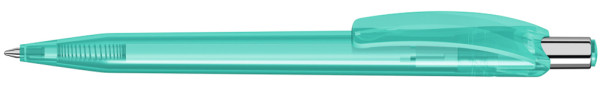 Druckkugelschreiber mit glänzend transparentem Gehäuse und Drückerstopfen. Drücker in silber... mehr