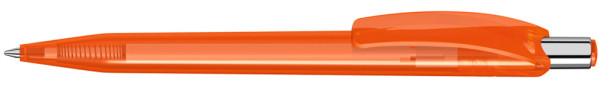 Druckkugelschreiber mit glänzend transparentem Gehäuse und Drückerstopfen. Drücker in silber glänzend.