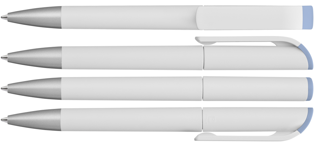 Drehkugelschreiber mit gedeckt mattem Gehäuse in weiß, farbig glänzendem Stopfen und Spitze silber matt.