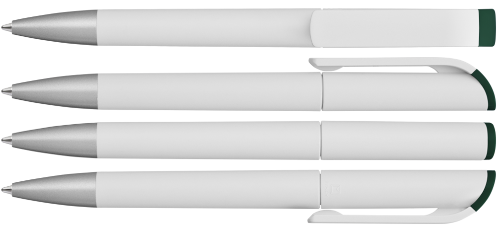 Drehkugelschreiber mit gedeckt mattem Gehäuse in weiß, farbig glänzendem Stopfen und Spitze silber matt.