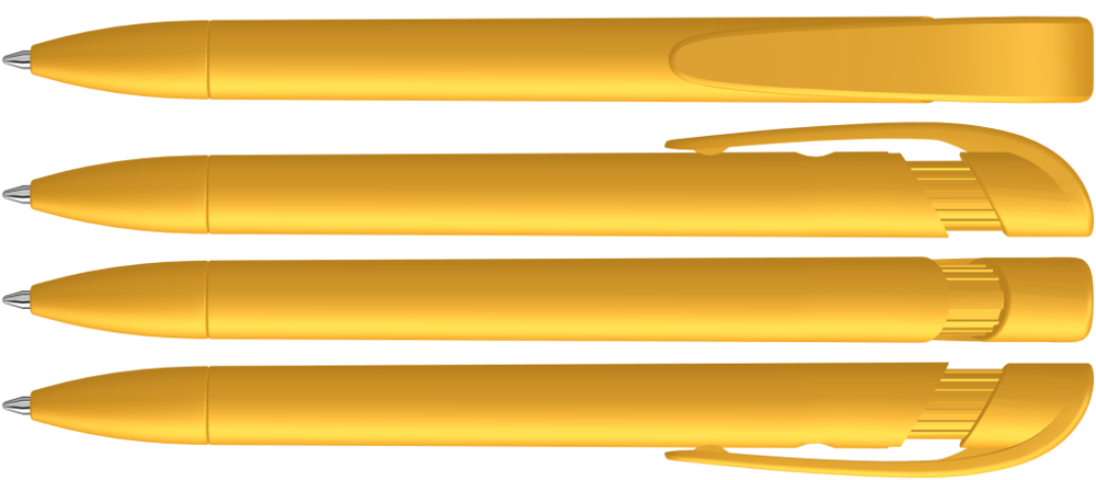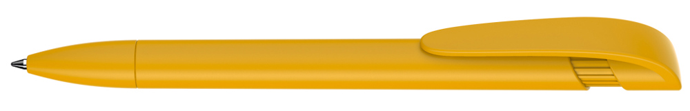 Druckkugelschreiber mit gedeckt mattem Gehäuse, breitem Bogenclipdrücker und Spitze.