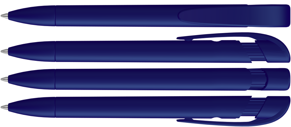 Druckkugelschreiber mit gedeckt mattem Gehäuse, breitem Bogenclipdrücker und Spitze.